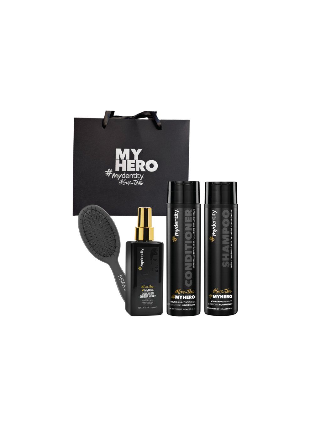 Dopřejte svým vlasům luxusní péči s exkluzivním setem od značky #MyDentity by Guy Tang. Tento balíček kombinuje vyživující produkty pro každodenní péči i styling. Navíc dárek Framar Black Brush: lehký, ergonomicky tvarovaný kartáč, který šetrně rozčesává vlasy bez tahání a lámání a dárková taška s mašlí.