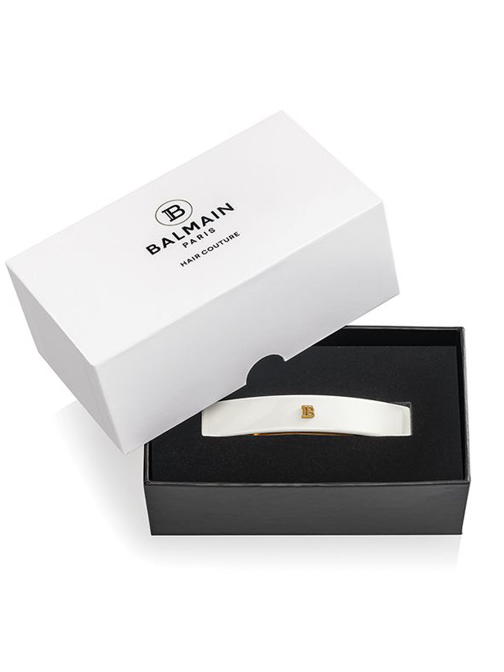 Vysoce kvalitní, ručně vyrobený vlasový klip z odolného acetátu celulózy, zdobený typickým znakem "B" vyvedeným z 14karátového plátkového zlata. Velice pevný, avšak pružný materiál je hypoalergenní a šetrný vůči vlasům i pokožce hlavy.