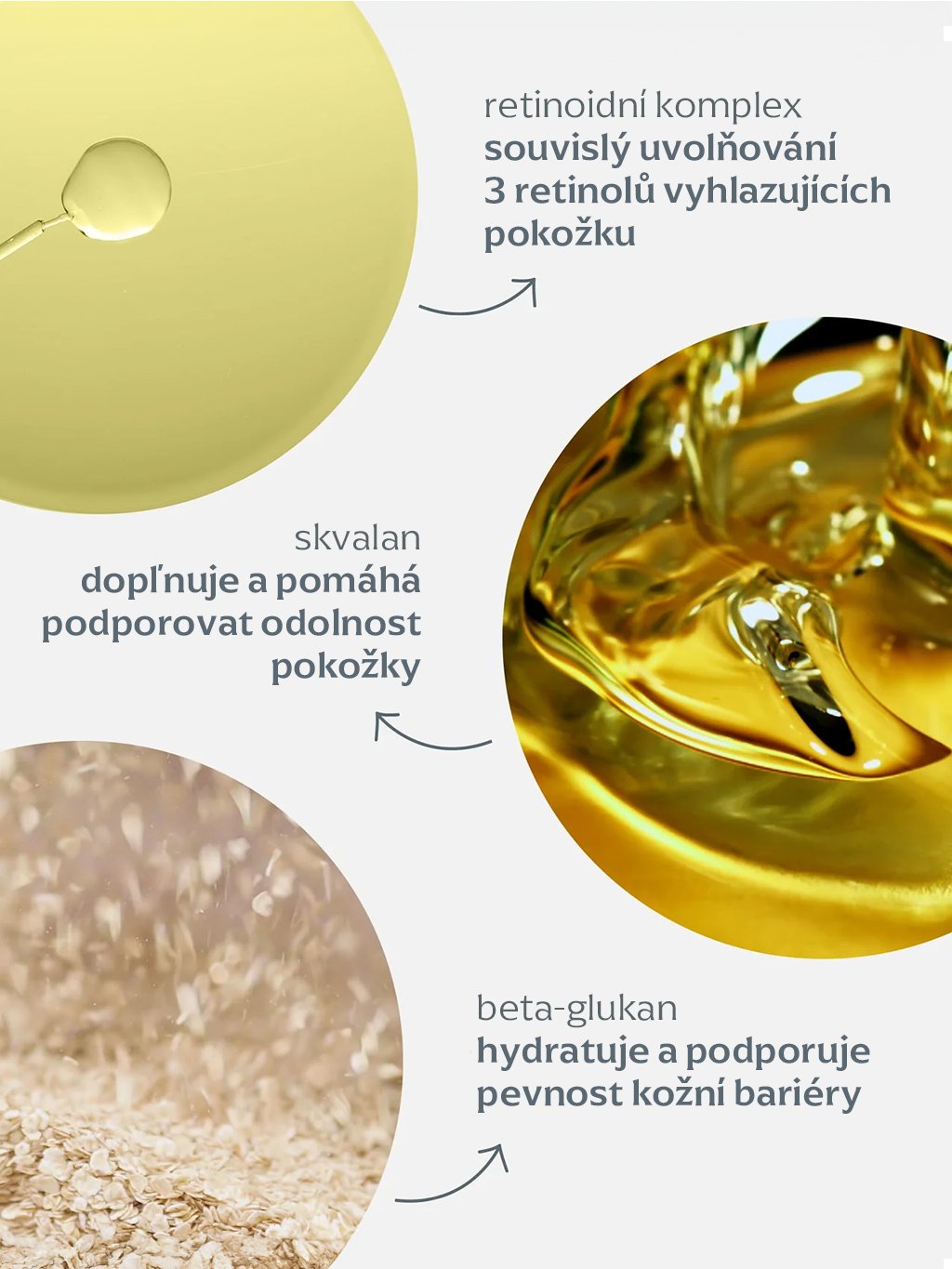 Enkapsulované kuličky retinolu postupně uvolňují retinol, který snižuje viditelnost jemných linek a vrásek a sjednocuje tón pleti.