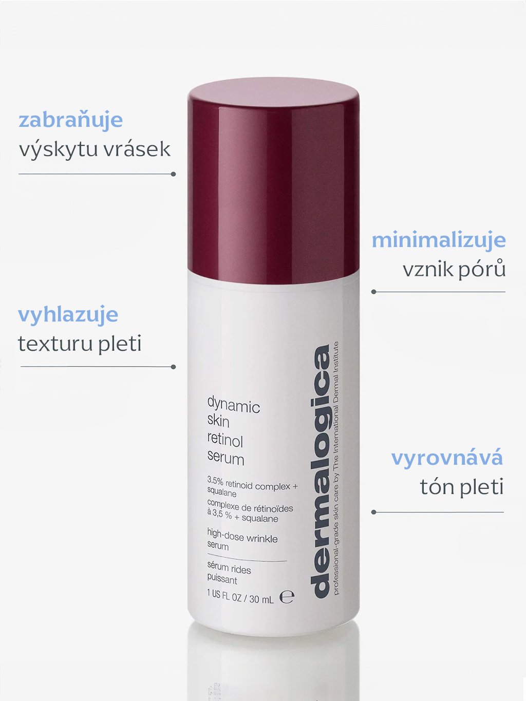 Retinol patří k nejoblíbenějším látkám v boji proti stárnutí pokožky. Ne všechny produkty s jeho obsahem však mohou nabídnout skutečně viditelné výsledky. Dermalogica vyvinula sérum s 3,5% retinolovým komplexem na bázi pokročilé směsi retinoidů a podpůrné technologie, které funguje rychleji než nejlepší konkurenční produkt**! Ve složení dále najdete skvalan a ovesný betaglukan podporující regeneraci a odolnost pokožky.