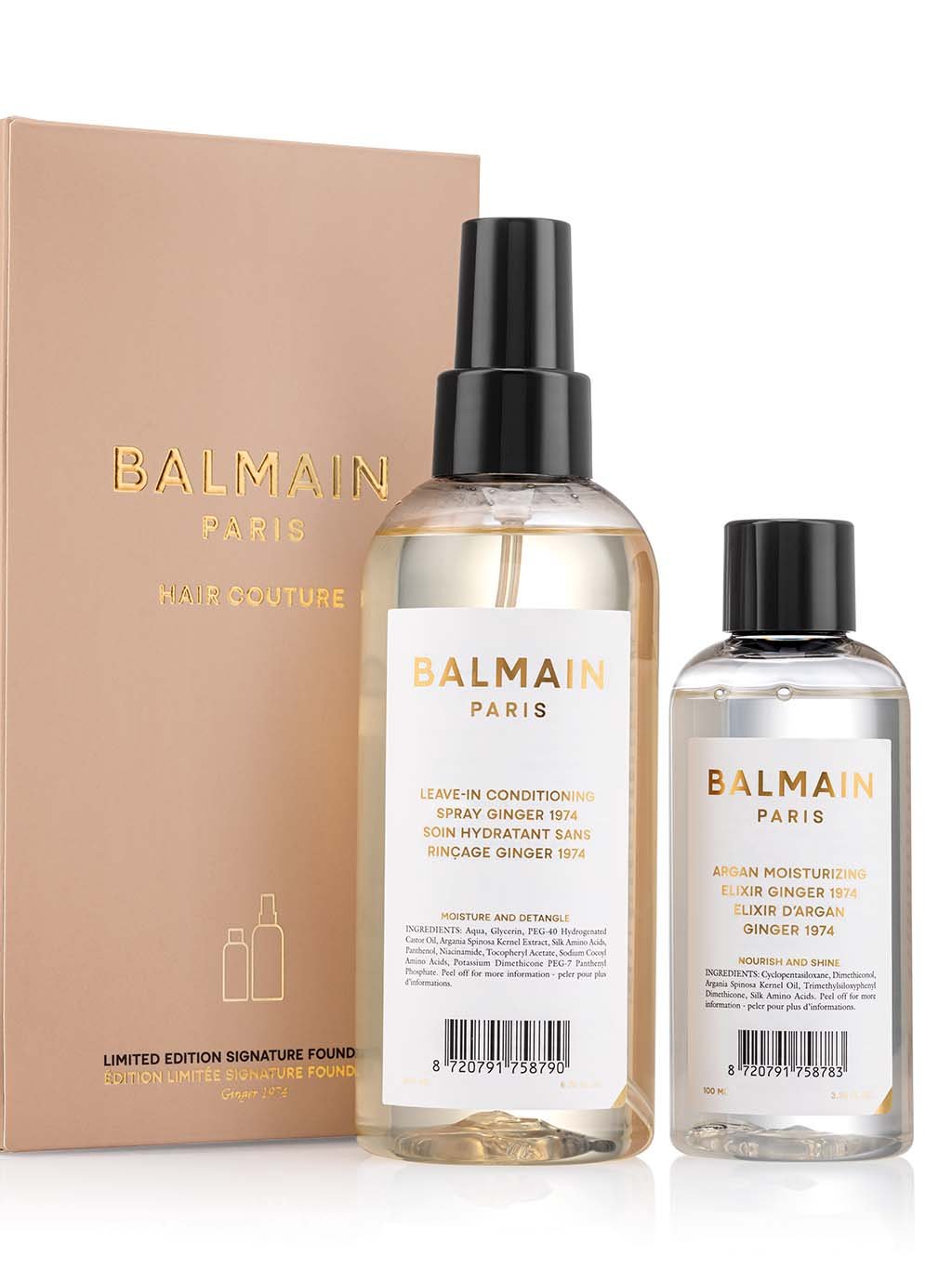 Sada nezbytností z limitované edice Muse de L’Eté obsahuje dva nejprodávanější produkty Balmain Hair, nyní s vůní nejprodávanějšího vlasového parfému Ginger 1974. Hlavní tón vůně představuje zázvor, díky němuž vůně přináší spojení povzbudivé svěžesti s kořenitostí, které se k létu skvěle hodí. Vůně je doplněna o svěží citrusový nádech a jemné květinové tóny, a vytváří tak vyváženou a osvěžující směs. Díky špičkové rovnováze výživy a vůně dotáhne tato exkluzivní sada jakýkoliv letní režim péče o vlasy k dokonalosti. Set obsahuje Leave-In Conditioning Spray s vůní Ginger 1974 a Argan Moisturizing Elixir s vůní Ginger 1974.