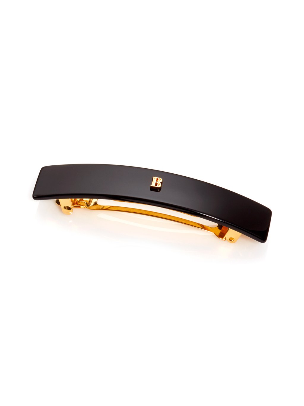 Vysoko kvalitný, ručne vyrobený vlasový klip z odolného acetátu celulózy, zdobený typickým znakom "B" vyvedeným z 14karátového plátkového zlata. Veľmi pevný, avšak pružný materiál je hypoalergénny a šetrný voči vlasom aj pokožke hlavy.