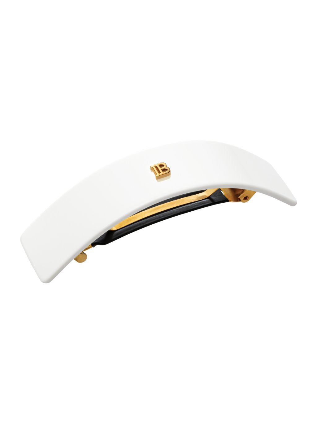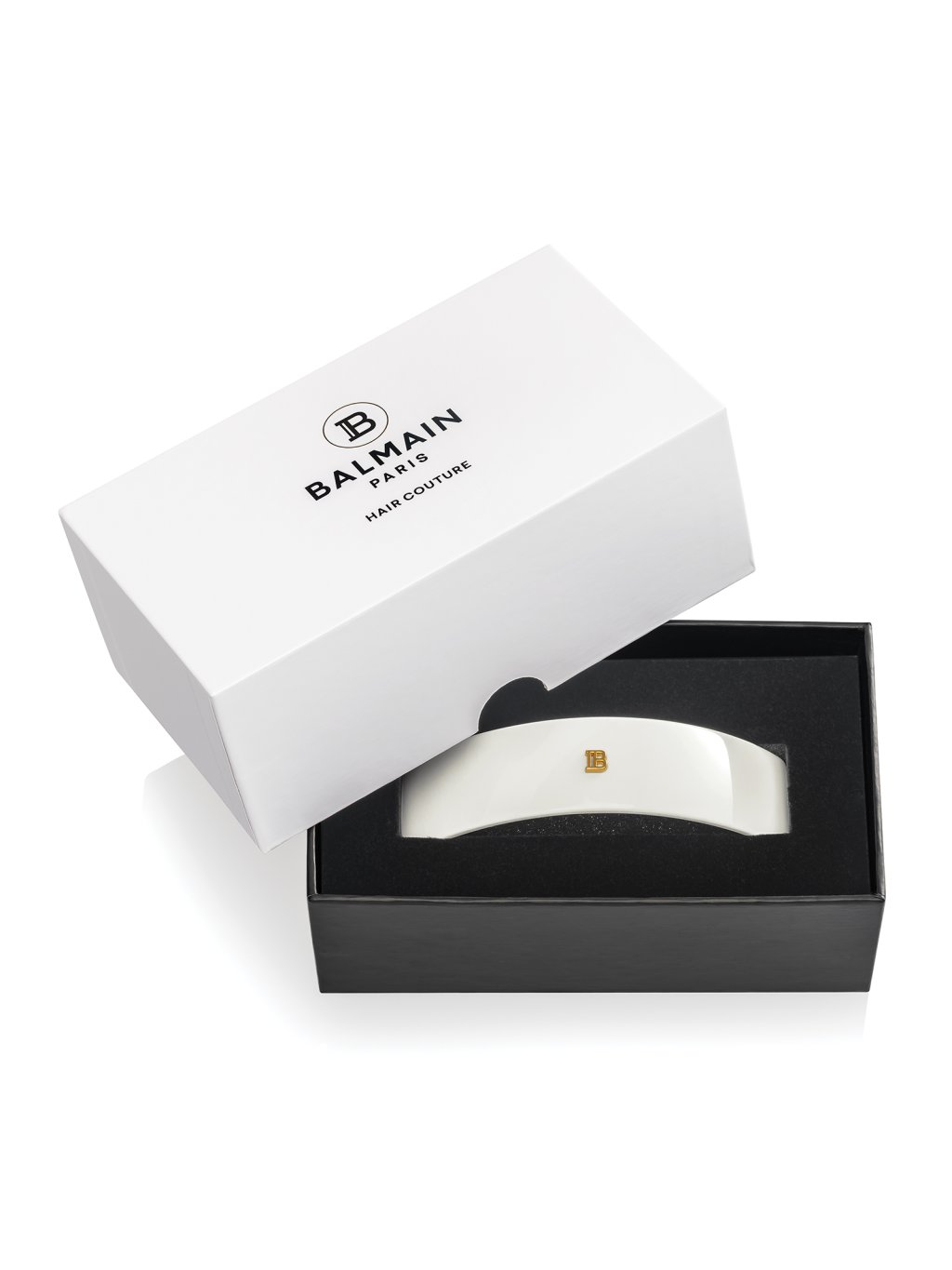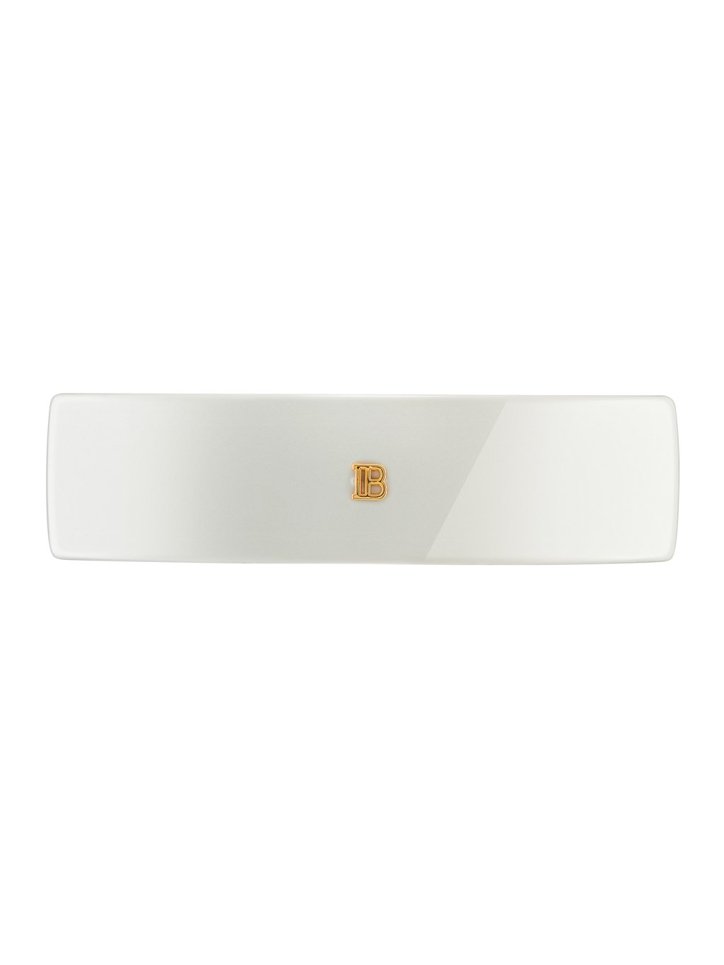 Vysoko kvalitný, ručne vyrobený vlasový klip z odolného acetátu celulózy, zdobený typickým znakom "B" vyvedeným z 14-karátového plátkového zlata. Veľmi pevný, avšak pružný materiál je hypoalergénny a šetrný voči vlasom i pokožke hlavy.