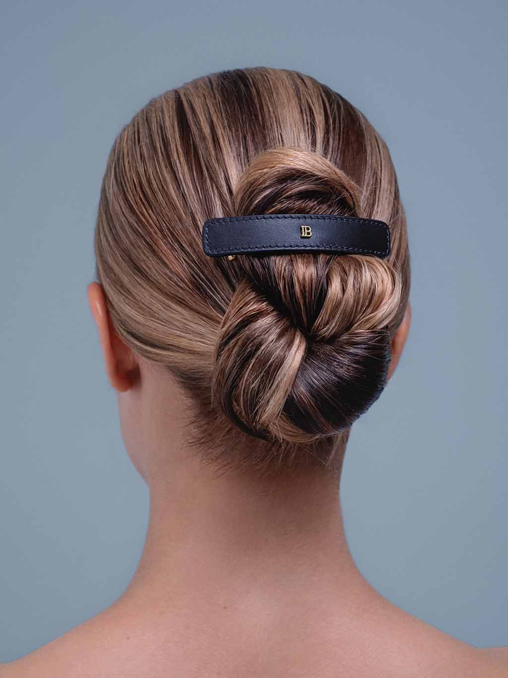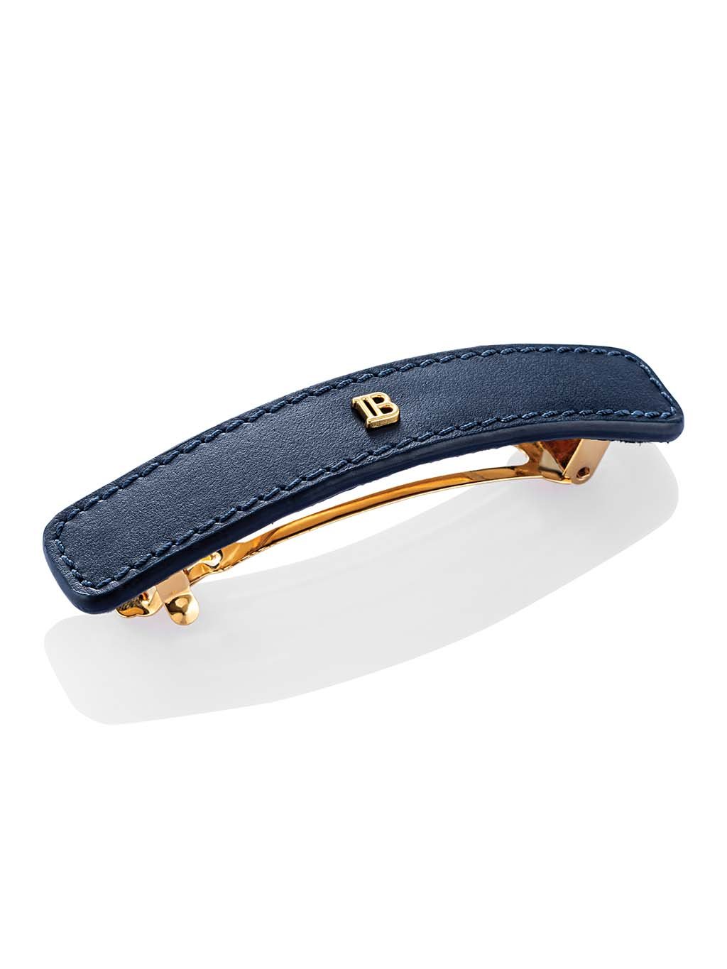 Charakteristická spona od Balmain Hair, vyrobená z vysoko kvalitnej kože sýtej modrej farby safíru, s logom „B“ pozláteným 18-karátovým zlatom. Tento doplnok spája odvahu a eleganciu a je tak predurčený k jemnému, no zároveň výnimočnému sebavyjadreniu.