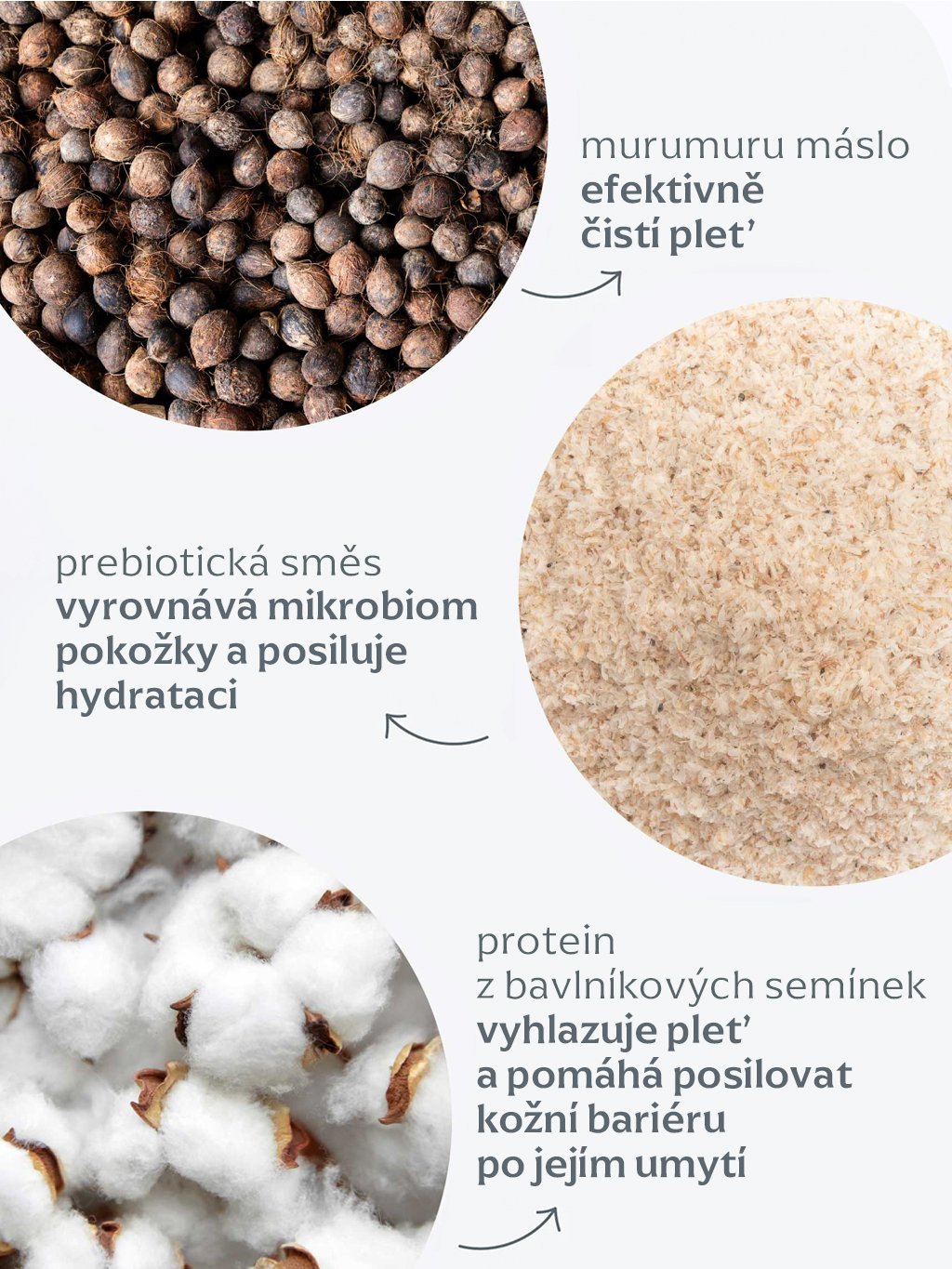 Vyživujúci a jemný čistiaci produkt pleť zbavuje nečistôt, mazu a make-upu a podporuje rovnováhu kožného mikrobiomu.