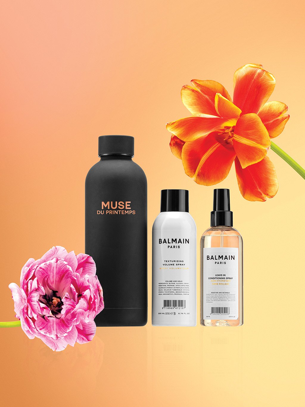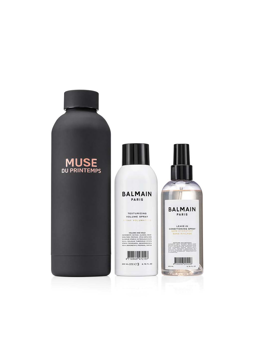 Sada obsahuje Leave-in Conditioning Spray, Texturizing Volume Spray, darček: čierna fľaša z nehrdzavejúcej ocele.