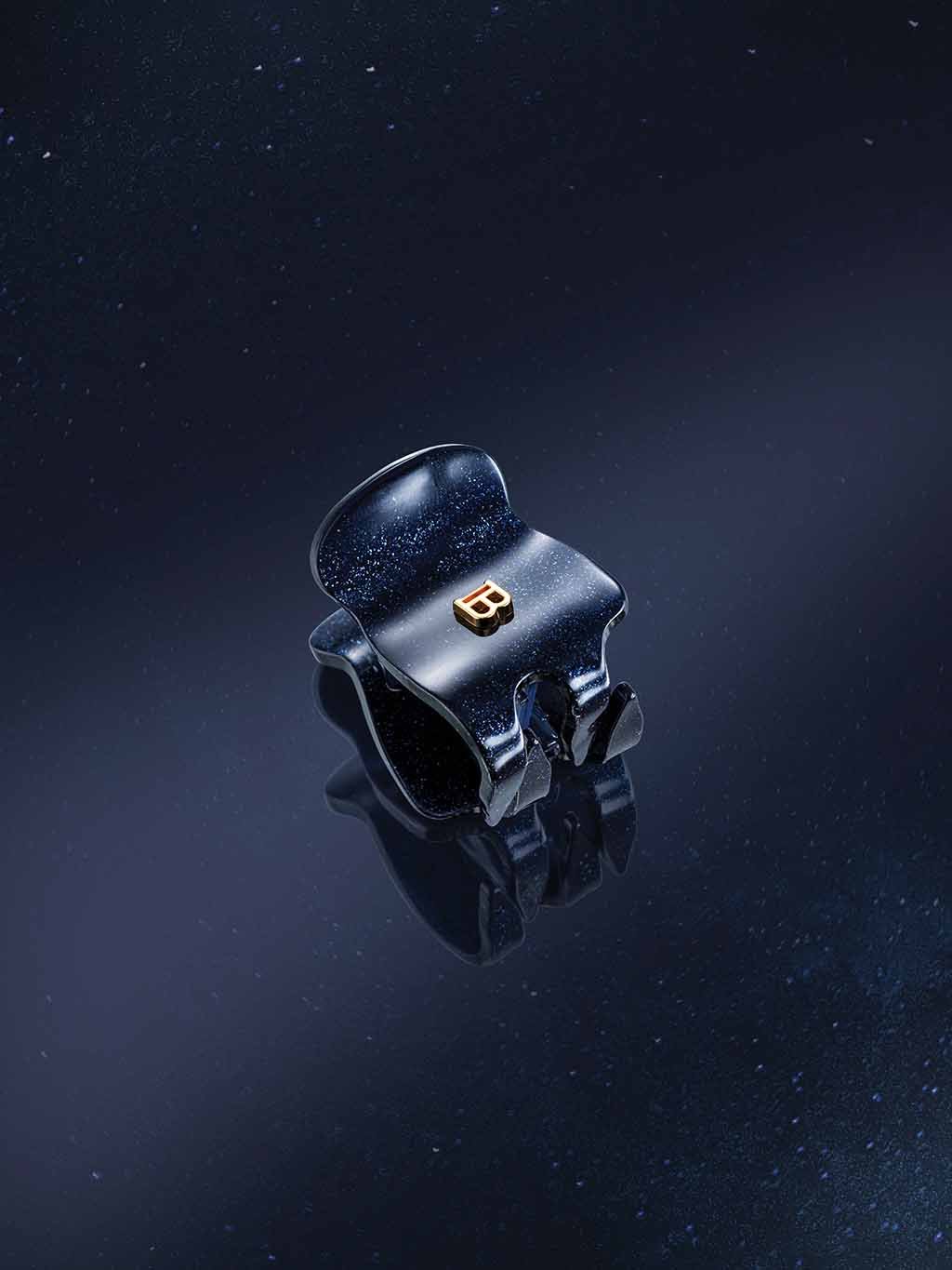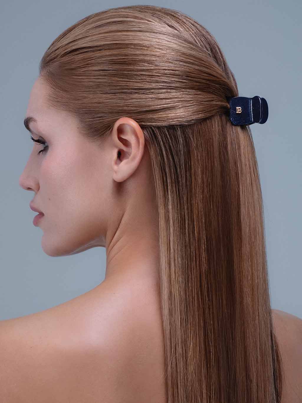Tento malý klip do vlasov, vyrobený z prvotriedneho acetátu v úchvatnej tmavomodrej farbe safíru s jemným trblietaním, je dokonalým doplnkom pre polocopy. Jeho kompaktná veľkosť a luxusné prevedenie z neho robia ideálnu voľbu pre každého, kto chce pridať svojmu každodennému stylingu nádych luxusu. S logom „B“ pozláteným 18-karátovým zlatom Balmain.