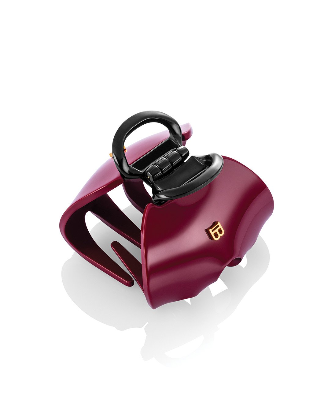 Ručne vyrobená sponka na vlasy z odolného acetátu celulózy v sametovo vínovej farbe s logom "B" pozláteným 18K zlatom Balmain.