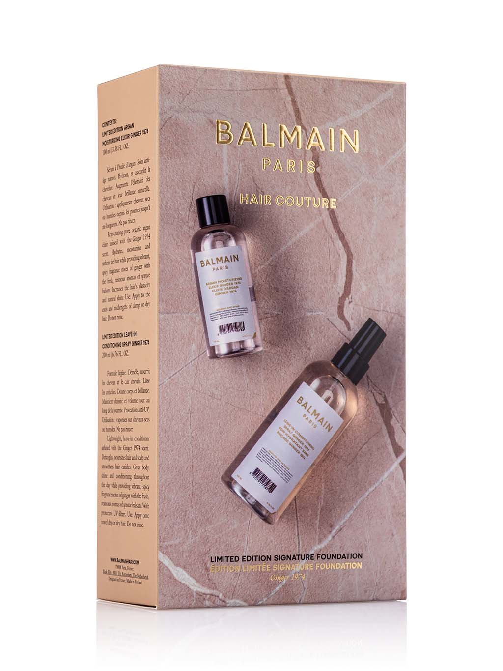 Sada nevyhnutností z limitovanej edície Muse de L’Été obsahuje dva najpredávanejšie produkty Balmain Hair, teraz s vôňou najpredávanejšieho vlasového parfumu Ginger 1974. Hlavným tónom vône je zázvor, ktorý prináša kombináciu povzbudzujúcej sviežosti a korenistosti – ideálnu na leto. Vôňa je doplnená o svieži citrusový nádych a jemné kvetinové tóny, čím vzniká vyvážená a osviežujúca zmes. Vďaka dokonalej rovnováhe výživy a vône táto exkluzívna sada dotiahne akýkoľvek letný režim starostlivosti o vlasy k dokonalosti. Sada obsahuje Leave-In Conditioning Spray s vôňou Ginger 1974 a Argan Moisturizing Elixir s vôňou Ginger 1974.