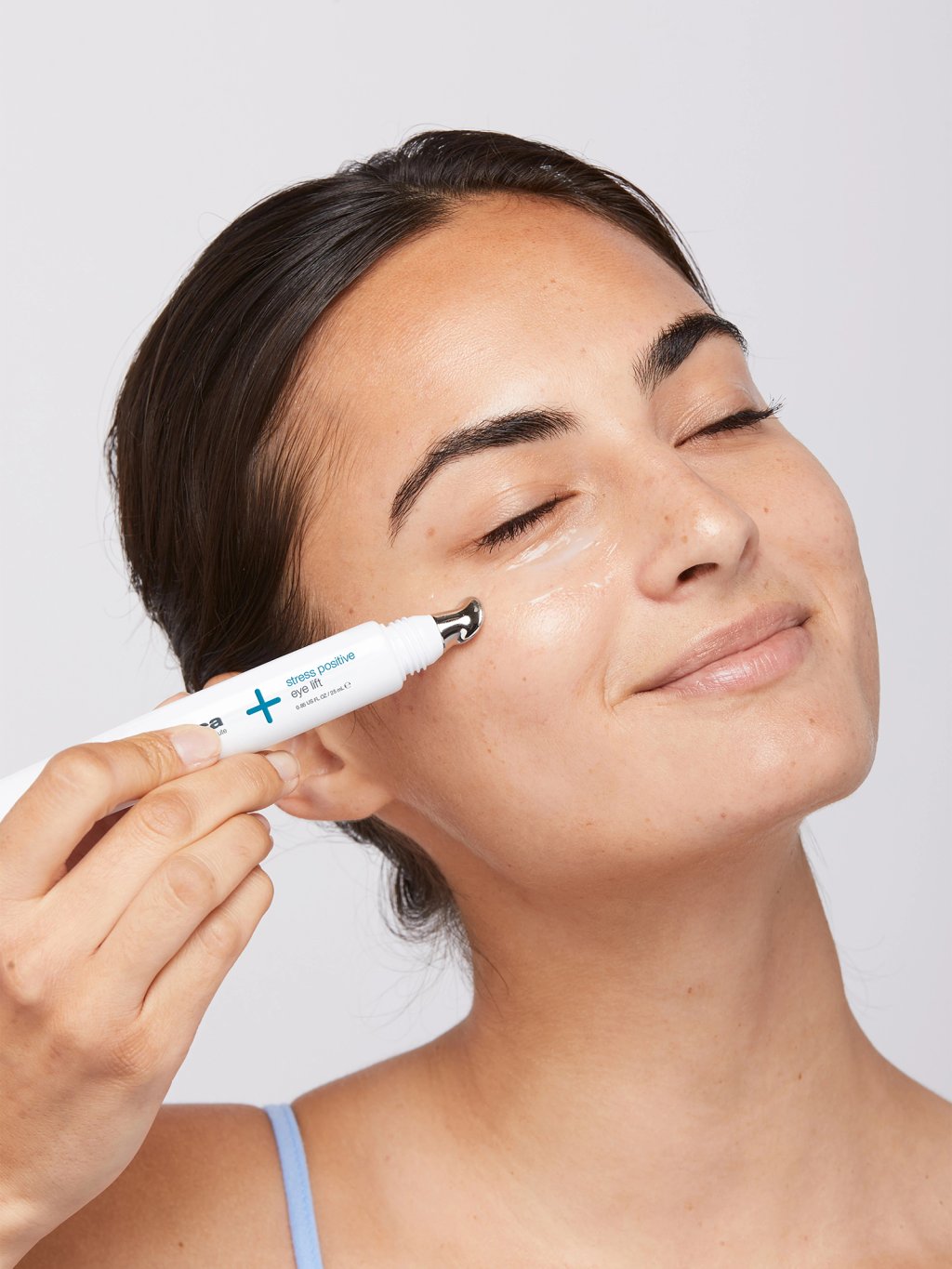 Stress Positive Eye Lift sa nanáša v dostatočnom množstve okolo očí pomocou chladiaceho masážneho aplikátora. Môže sa nechať pôsobiť 3-5 minút ako maska, prebytočný produkt sa potom vmasíruje do pleti alebo sa utrú kozmetickým obrúskom. Prípadne môžete produkt aplikovať prostredníctvom exkluzívnej 3-krokovej auto-masáže od Dermalogicy Eye Lift DIY, ktorá ešte viac podporí rozžiarený, svieži vzhľad. Produkt sa aplikuje podľa potreby na okamžitý účinok alebo denne na odstránenie prejavov chronickej únavy očí.