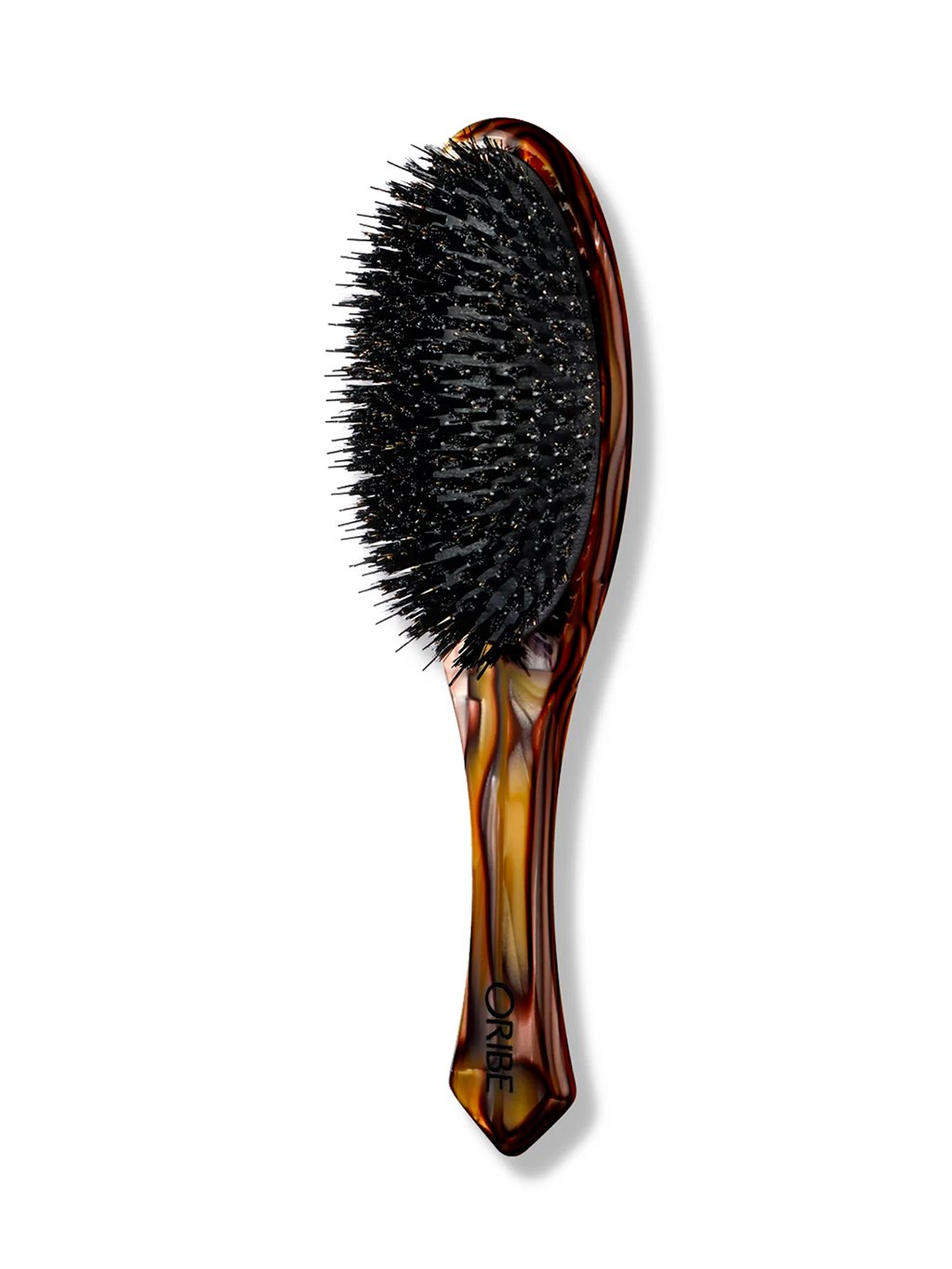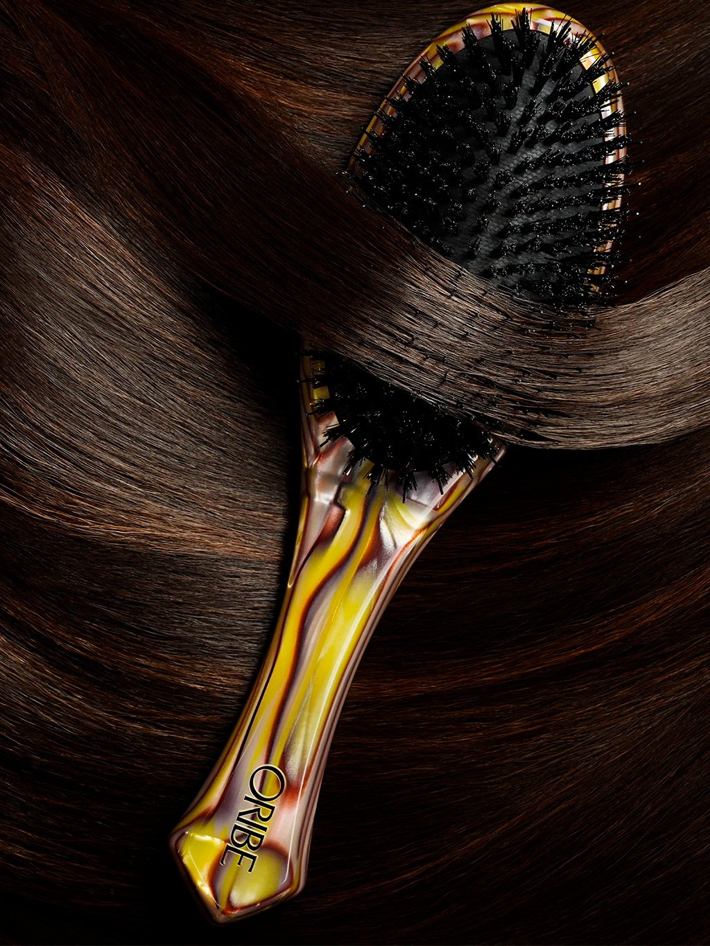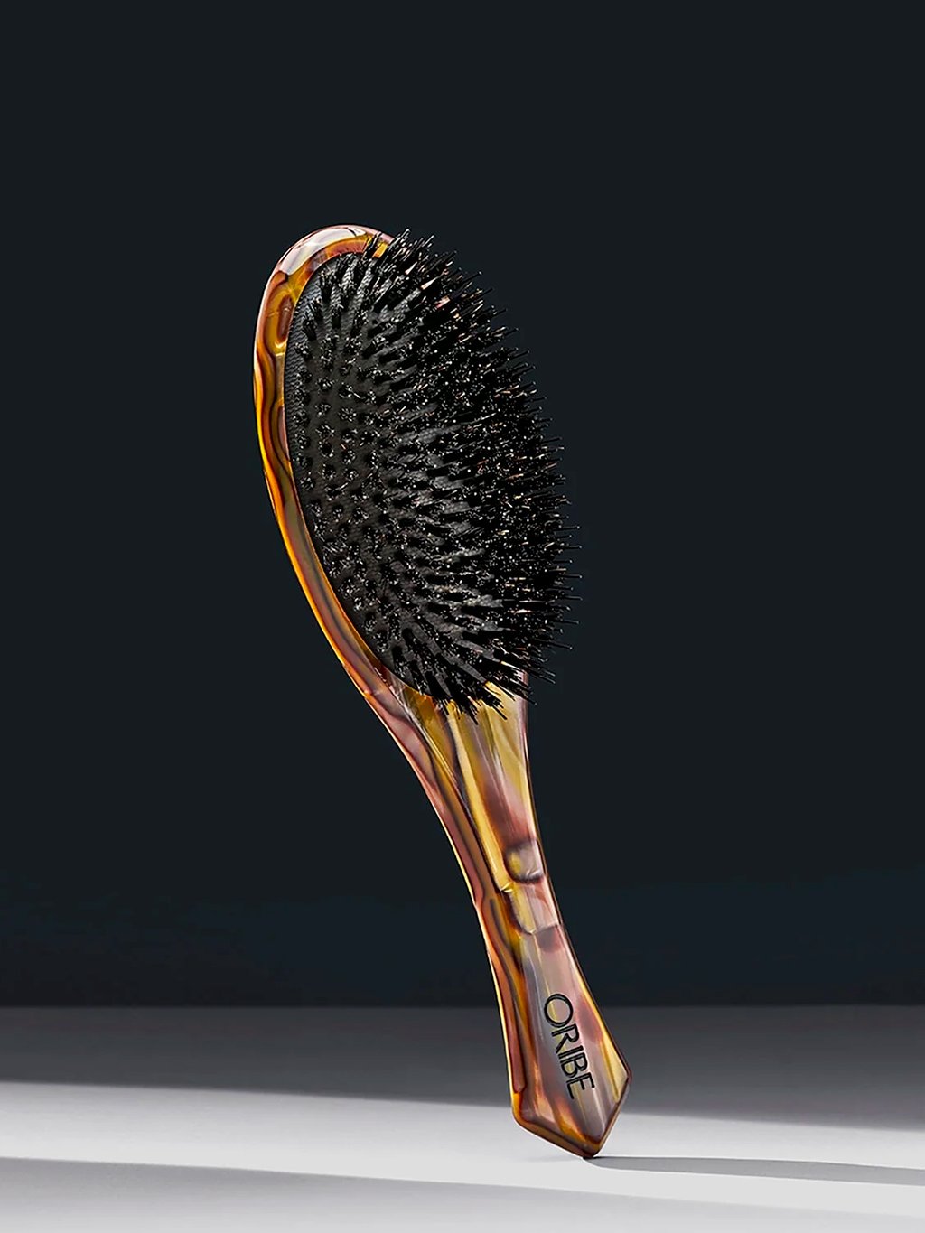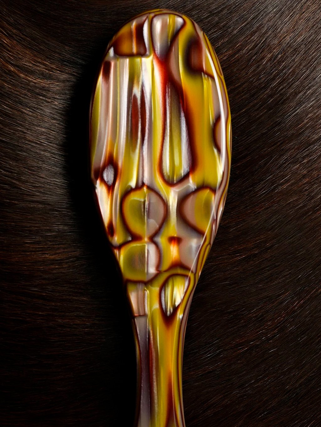 Kartáč obsahuje zmes kančích štetín a zaoblených nylonových kolíkov s 97% prírodným gumovým vankúšom, ktorý jemne stimuluje pokožku hlavy a uhladzuje vlasy pre ultra lesklý a hladký vzhľad.
